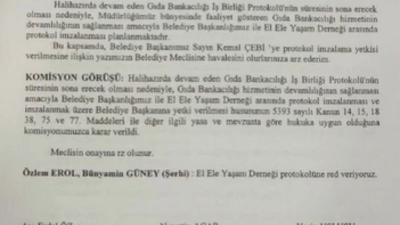 KOMİSYON GÖRÜŞÜ: Halihazırda devam eden Gıda Bankacılığı iş Birliği Protokolünün süresinin sona erecek olması nedeniyle, Gıda Bankacılığı hizmetinin devamlılığının sağlanması amacıyla Belediye Başkanlığımız ile El Ele Yaşam Derneği arasında protokol imzalanması ve imzalanmak üzere Belediye Başkanına yetki verilmesi hususunun 5393 sayılı Kanun 14, 15, 18 38, 75 ve 77. Maddeleri ile diğer ilgili yasa ve mevzuata göre hukuka uygun olduğuna komisyonumuzca karar verildi.